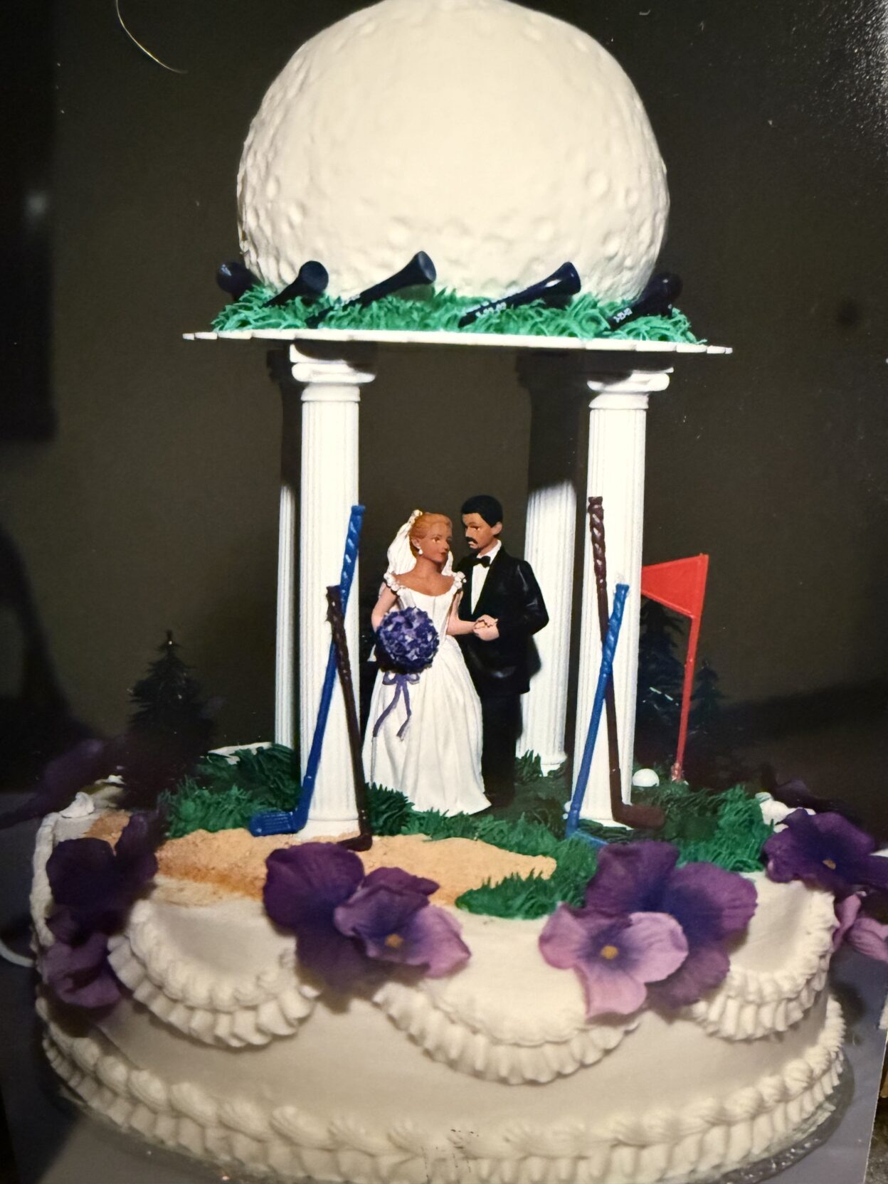 To no one’s surprise, even the wedding day revolved around the sport. They said their vows on top of a putting green cutout, they cut into a golf ball wedding cake and even drove away on a golf cart adorned with a “just married” sign at the end of the night.